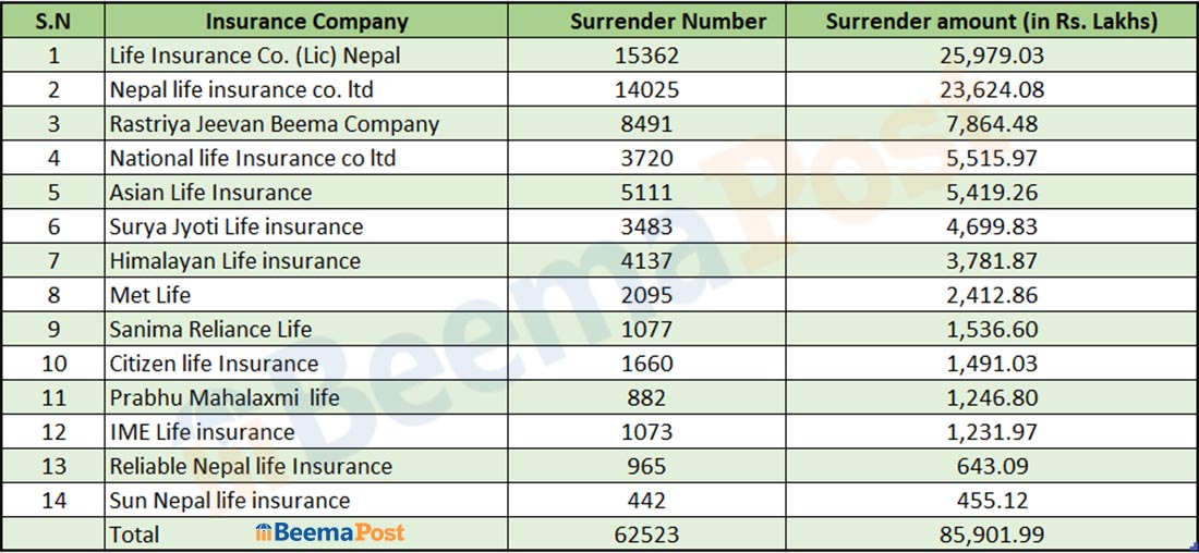 त्यस्तै, नेशनल लाइफ इन्स्योरेन्सको ५५ करोड १५ रुपैयाँ, एशियन लाइफ इन्स्योरेन्सको ५४ करोड १९ लाख रुपैयाँ, सूर्य ज्योति लाइफ इन्स्योरेन्सको ४६ करोड ९९ लाख रुपैयाँ, हिमालयन लाइफ इन्स्योरेन्सको ३७ करोड ८१ लाख रुपैयाँ र मेट लाइफको २४ करोड १२ लाख रुपैयाँ बराबरको बीमा पोलिसी सरेण्डर भएका छन् ।