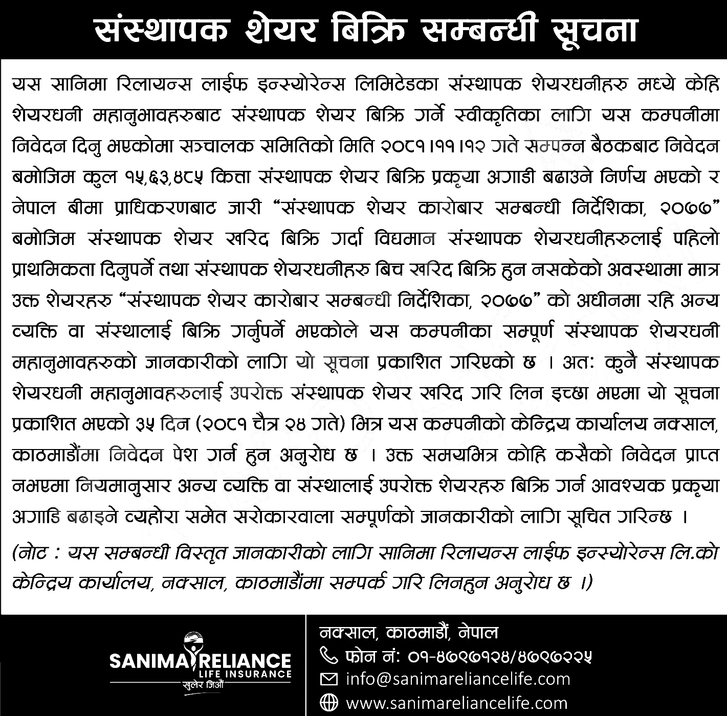 उक्त शेयर किन्न इच्छुक विद्यमान संस्थापक शेयरधनीहरूले आगामी ३५ दिन (चैत १४ गते) भित्र काठमाडौंको नक्सालस्थित कम्पनीको केन्द्रीय कार्यालयमा निवेदन दिनु पर्नेछ।
