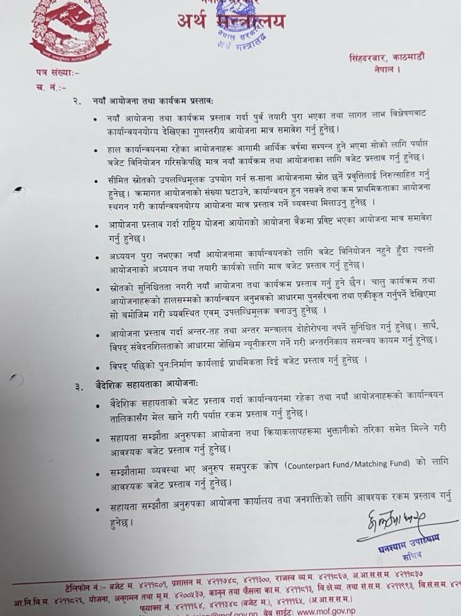 स्रोत व्यवस्थानमा परेको दवाव तथा सार्वजनिक खर्चको उपलब्धि बढाई आर्थिक गतिविधि विस्तार गर्नुपर्ने आवश्यकतालाई समेत ध्यानमा राखेर आयोजना तथा कार्यक्रमलाई प्राथमिकीकरण गर्नुपर्ने अवस्थालाई मध्य नजर गरेर बजेट मार्गदर्शन गर्न मन्त्रालयले अनुरोध गरेको छ ।