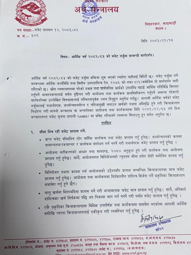 काठमाडौं । अर्थमन्त्रालयलले आर्थिक वर्ष २०८२।८३ को बजेट तर्जुमा सम्बन्धि मार्गदर्शन जारी गरेको छ । मन्त्रालयले बजेट तर्जुमा गर्ने सम्बन्धमा आर्थिक कार्यबिधि तथा वित्तीय उत्तरदायित्व ऐन, २०७६ को दफा ८(१) बमोजिम सो मार्गदर्शन जारी गरेको हो ।