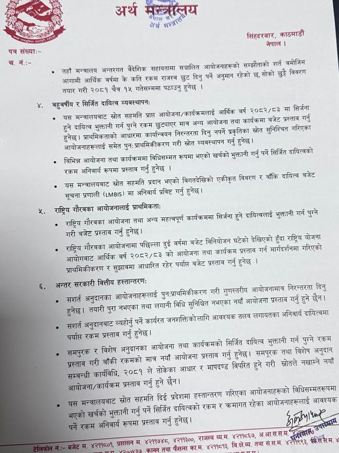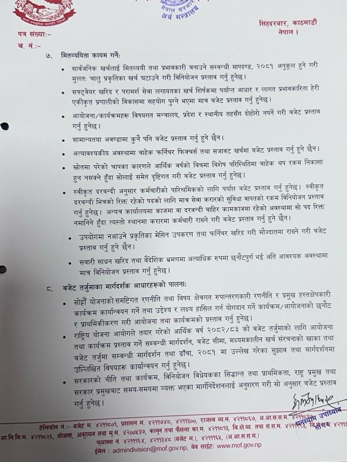 स्रोत व्यवस्थानमा परेको दवाव तथा सार्वजनिक खर्चको उपलब्धि बढाई आर्थिक गतिविधि विस्तार गर्नुपर्ने आवश्यकतालाई समेत ध्यानमा राखेर आयोजना तथा कार्यक्रमलाई प्राथमिकीकरण गर्नुपर्ने अवस्थालाई मध्य नजर गरेर बजेट मार्गदर्शन गर्न मन्त्रालयले अनुरोध गरेको छ ।