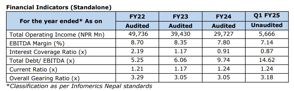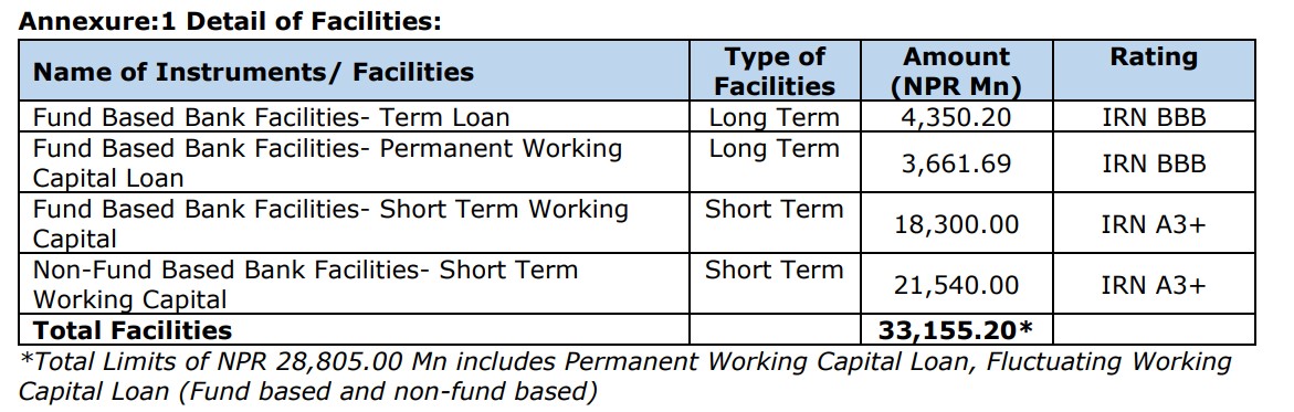 कम्पनीले ३३ अर्ब १५ करोड ५२ लाख रुपैयाँ बैंकिङ कर्जाका लागि इन्फोमेरिक्स क्रेडिट रेटिङबाट रेटिङ गराएको छ । ८ अर्ब १ करोड १८ लाख रुपैयाँको दीर्घकालीन कर्जाका लागि कम्पनीले आइआरएन ट्रिपल बी र ३९ अर्ब रुपैयाँको अल्पकालीन कर्जाका लागि आइआरएन एथ्रीप्लस रेटिङ पुनः पुष्टि गराएको छ ।