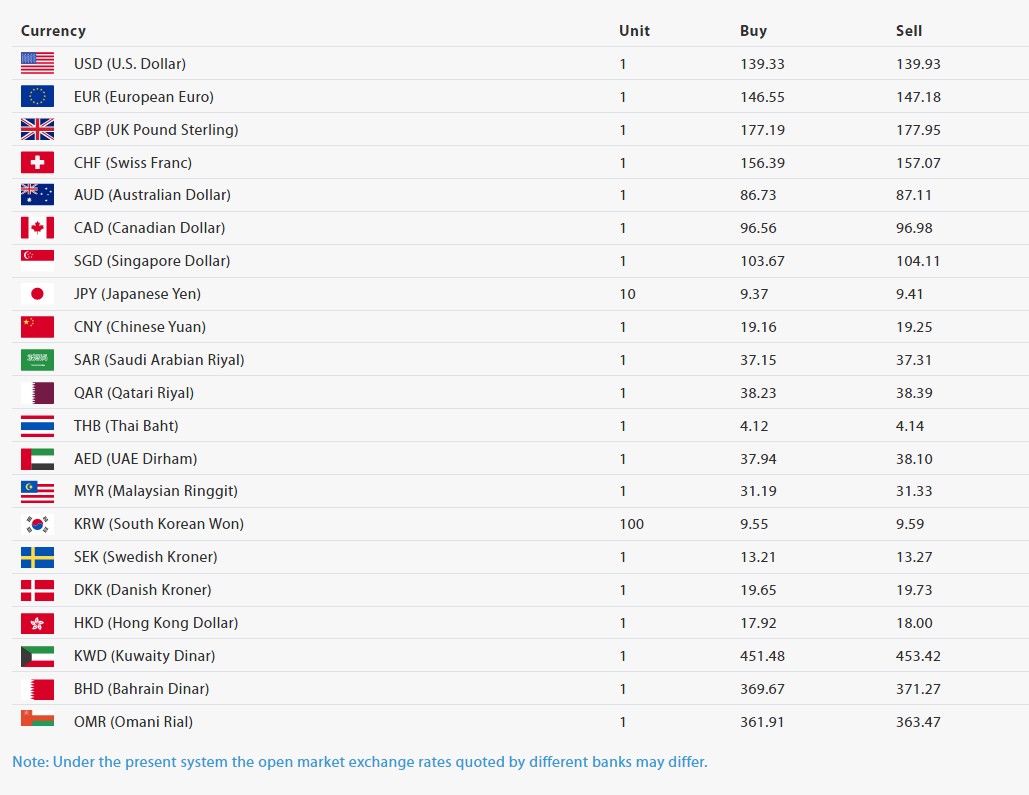 सिङ्गापुर डलर एकको खरिददर १०३.६७ रुपैयाँ र बिक्रीदर १०४.११ रुपैयाँ, जापानी येन १० को खरिददर ९.३७ रुपैयाँ र बिक्रीदर ९.४१ रुपैयाँ, चिनियाँ युआन एकको खरिददर १९.१६ रुपैयाँ र बिक्रीदर १९.२५ रुपैयाँ, साउदी रियाल एकको खरिददर ३७.१५ रुपैयाँ र बिक्रीदर ३७.३१ रुपैयाँ र कतारी रियाल एकको खरिददर ३८.२३ रुपैयाँ र बिक्रीदर ३८.३९ रुपैयाँ निर्धारण गरिएको छ।