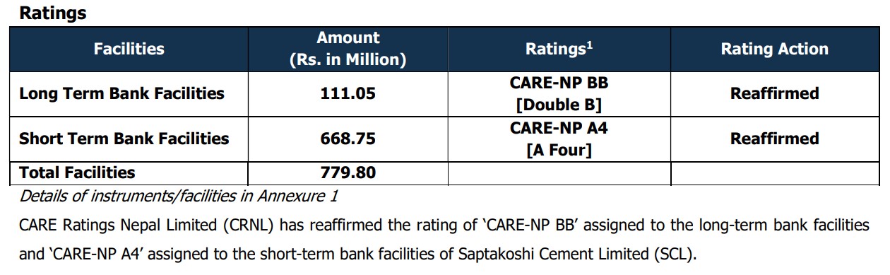 कम्पनीले ७७ करोड ९८ लाख रुपैयाँ बैंकिङ कर्जाका लागि केयर रेटिङ नेपालबाट रेटिङ गराएको छ । ११ करोड १० लाख रुपैयाँको दीर्घकालीन कर्जाका लागि कम्पनीले केयर एनपि डबल बि र ६६ करोड ८७ लाख रुपैयाँको अल्पकालीन कर्जाका लागि केयर एनपि ए४ रेटिङ पुष्टि गराएको छ ।