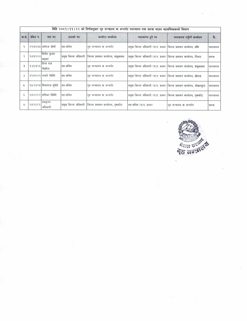 सरुवा भएका ७ जनामध्ये रामकृष्ण अधिकारी नुवाकोटबाट गृह मन्त्रालयमा ल्याइएका छन् भने शशीधर घिमिरेलाई नुवाकोट पठाइएको छ ।