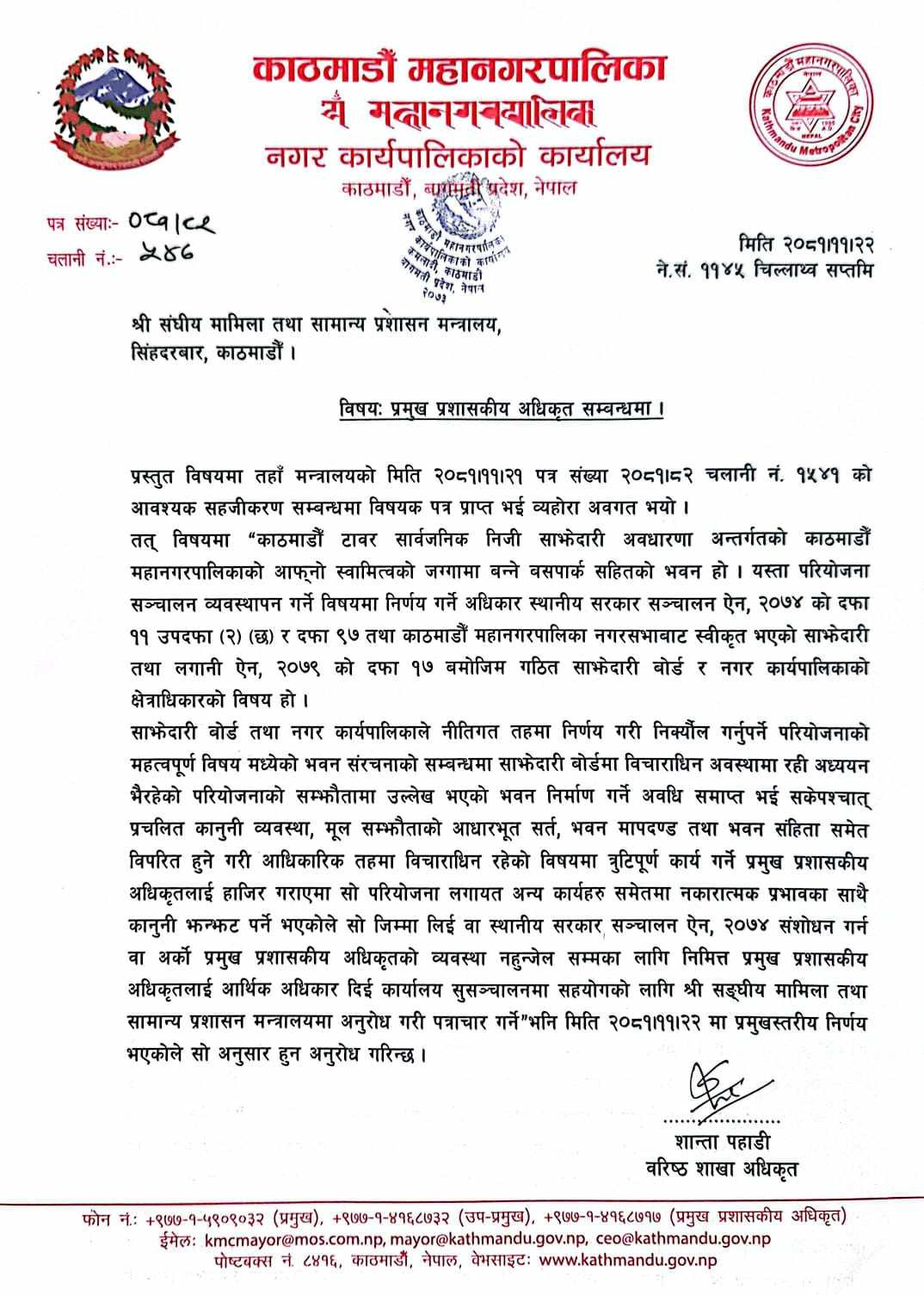प्रमुखस्तरीय निर्णयबारे जानकारीसहित शाखा अधिकृत शान्ता पहाडी हस्ताक्षरित पत्रमा भनिएको छ,‘काठमाडौं टावर सार्वजनिक निजी साझेदारी अवधारणा अन्तर्गतको काठमाडौं महानगरपालिकाको आफ्नो स्वामित्वको जग्गामा बन्ने बसपार्कसहितको भवन हो। यस्ता परियोजना सञ्चालन व्यवस्थापन गर्ने विषयमा निर्णय गर्ने अधिकारी स्थानीय सरकार सञ्चालन ऐन २०७४ को दफा ११ उपदफा (२) (६) र दफा ९७ तथा काठमाडौं महानगरपालिका नगरसभाबाट स्वीकृत भएको साझेदारी तथा लगानी ऐन २०७९ को दफा १७ बमोजिम गठित साझेदारी बोर्ड र नगर कार्यपालिकाको क्षेत्राधिकारको विषय हो।’