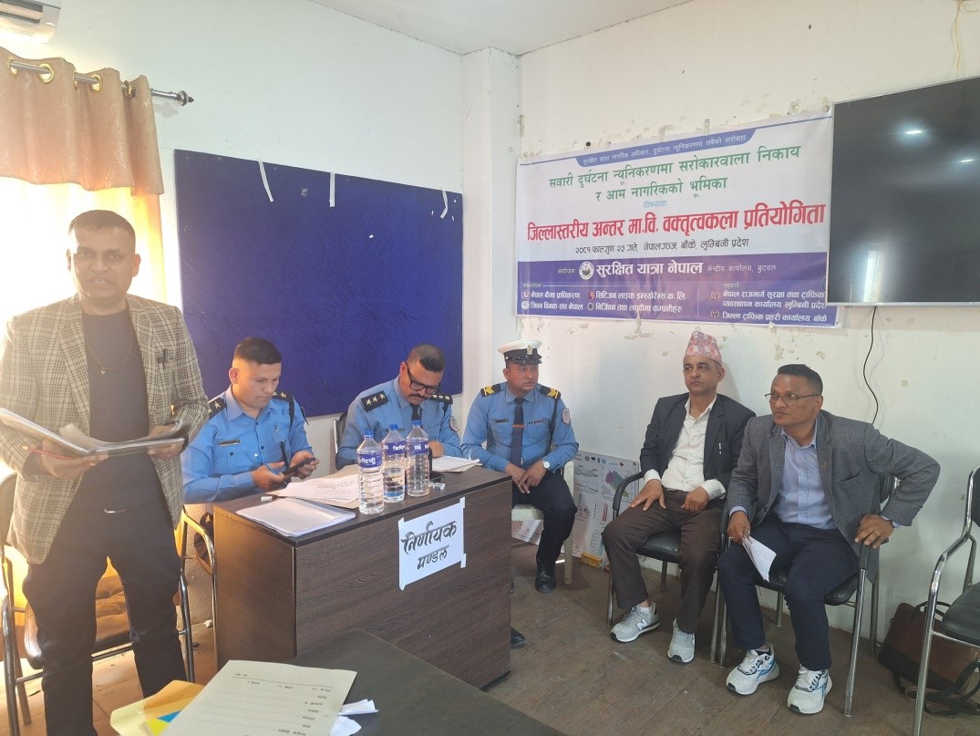 सडक दुर्घटना न्यूनिकरणमा ट्राफिक तथा सरोकारवालाहरुको भूमिका विषयमा माध्यामिक विद्यालय स्तरीय निबन्ध प्रतियोगिता भएको थियो साथै उक्त प्रतियोगिता कार्यक्रममा २० वटा विद्यालयहरुले भाग लिएका थिए ।