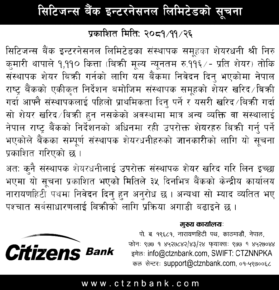 काठमाडौं । सिटिजन्स बैंक इन्टरनेशनल लिमिटेडले १ हजार ११० कित्ता संस्थापक शेयर बिक्रीमा राखेको छ। बैंकले यी शेयर हाल बैंककै विद्यमान संस्थापक शेयरधनीहरूले मात्र किन्न पाउने गरी बिक्रीमा राखेको हो।
