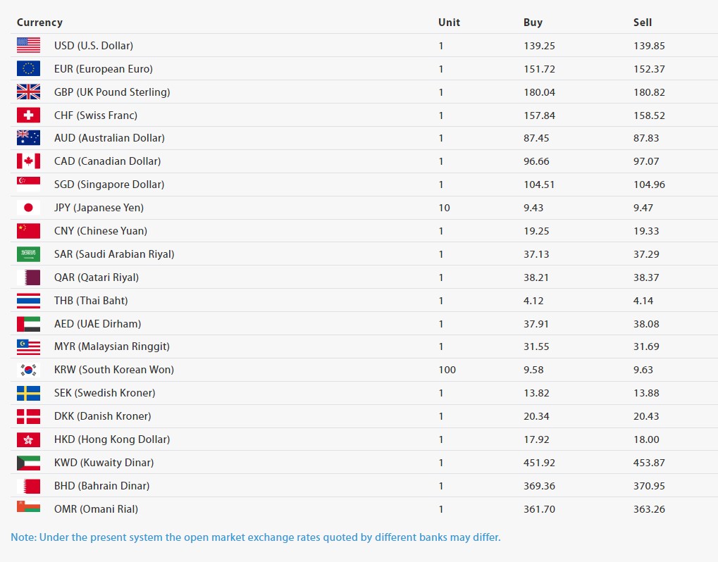 सिङ्गापुर डलर एकको खरिददर १०४.५१ रुपैयाँ र बिक्रीदर १०४.९६ रुपैयाँ, जापानी येन १० को खरिददर ९.४३ रुपैयाँ र बिक्रीदर ९.४७ रुपैयाँ, चिनियाँ युआन एकको खरिददर १९.२५ रुपैयाँ र बिक्रीदर १९.३३ रुपैयाँ, साउदी रियाल एकको खरिददर ३७.१३ रुपैयाँ र बिक्रीदर ३७.२९ रुपैयाँ र कतारी रियाल एकको खरिददर ३८.२१ रुपैयाँ र बिक्रीदर ३८.३७ रुपैयाँ निर्धारण गरिएको छ।