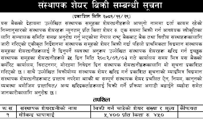 उक्त शेयरको न्यूनतम मूल्य प्रतिकित्ता ४५० रुपैयाँ तोकिएको छ। शेयर खरिद गर्न इच्छुक संस्थापक शेयरधनीले आगमी वैशाख ३ गतेभित्र विराटनगरस्थित बैंकको कर्पाेरेट कार्यालयमा निवेदन दिनु पर्नेछ।
