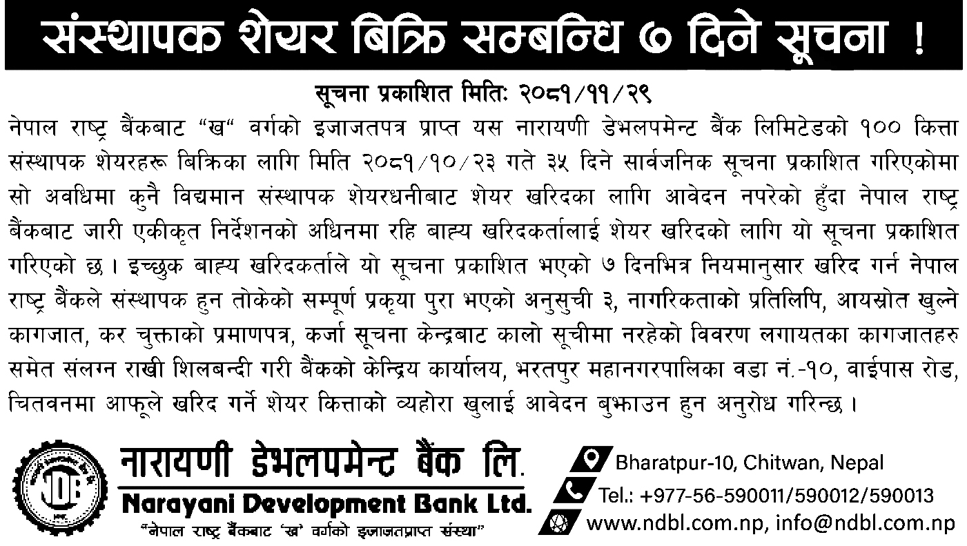 काठमाडौं । नारायणी डेभलपमेन्ट बैंक लिमिटेडले १०० कित्ता संस्थापक शेयर सर्वसाधारणले खरिद गर्न पाउने गरी बिक्रीमा राखेको छ।