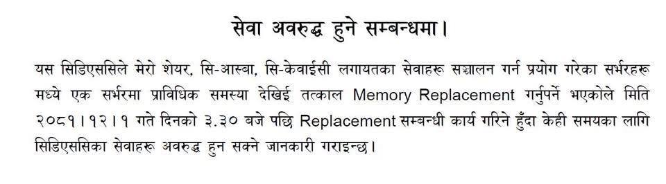 सिडिएसले जारी गरेको सूचनामा मेमोरी रिप्लेसमेन्ट कार्यको कारण सेवामा आएको विघ्नलाई व्यवस्थापन गर्नका लागि प्राविधिक टोली कार्यरत हुनेछ। यस प्रक्रियामा सेवामा भएको असुविधाको लागि सिडिएसले ग्राहकहरूबाट सहकार्य र माफी पनि मागेको छ।