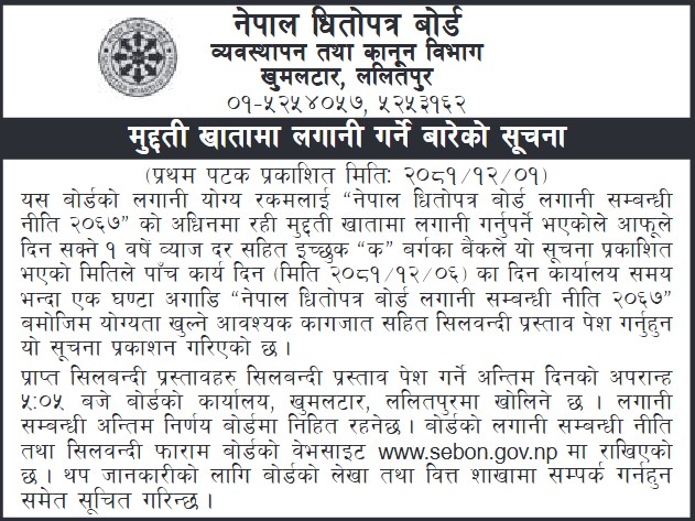 बोर्डले प्राप्त सिलबन्दी प्रस्तावहरू सोही दिन अपराह्न ५:०५ बजे कार्यालयमा खोलिने जानकारी दिएको छ। बैंकहरूबाट प्राप्त प्रस्तावहरूमध्ये अन्तिम निर्णय गर्ने अधिकार बोर्डमै निहित रहनेछ।