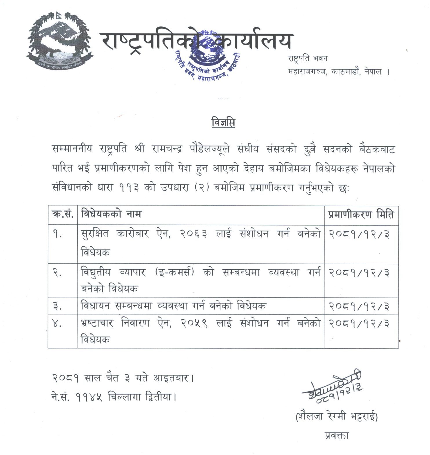 प्रमाणीकरण भएका विधेयकमा सुरक्षित कारोबार ऐनलाई संशोधन गर्न बनेको विधेयक, इकमर्ससम्बन्धी विधेयक, विधायन सम्बन्धमा व्यवस्था गर्न बनेको विधेयक र भ्रष्टाचार निवारण ऐनलाई संशोधन गर्न बनेको विधेयक रहेको राष्ट्रपति कार्यालयले जारी गरेको विज्ञप्तिमा उल्लेख छ ।
