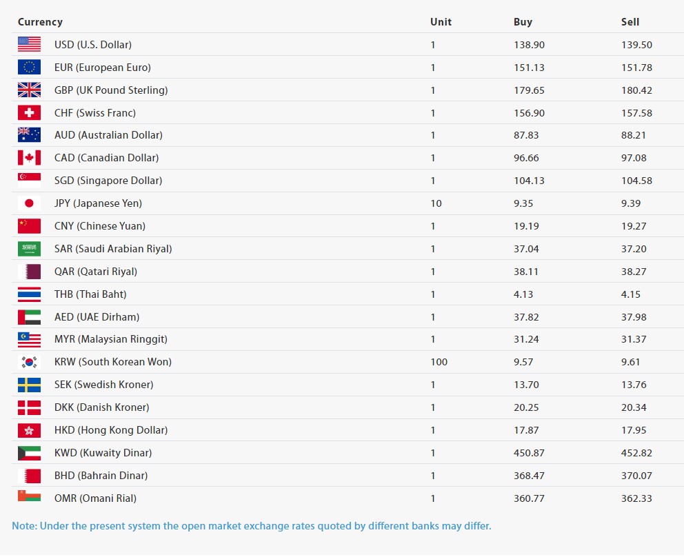 सिङ्गापुर डलर एकको खरिददर १०४.१३ रुपैयाँ र बिक्रीदर १०४.५८ रुपैयाँ, जापानी येन १० को खरिददर ९.३५ रुपैयाँ र बिक्रीदर ९.३९ रुपैयाँ, चिनियाँ युआन एकको खरिददर १९.१९ रुपैयाँ र बिक्रीदर १९.२७ रुपैयाँ, साउदी रियाल एकको खरिददर ३७.०४ रुपैयाँ र बिक्रीदर ३७.२० रुपैयाँ तथा कतारी रियाल एकको खरिददर ३८.११ रुपैयाँ र बिक्रीदर ३८.२७ रुपैयाँ निर्धारण गरिएको छ।