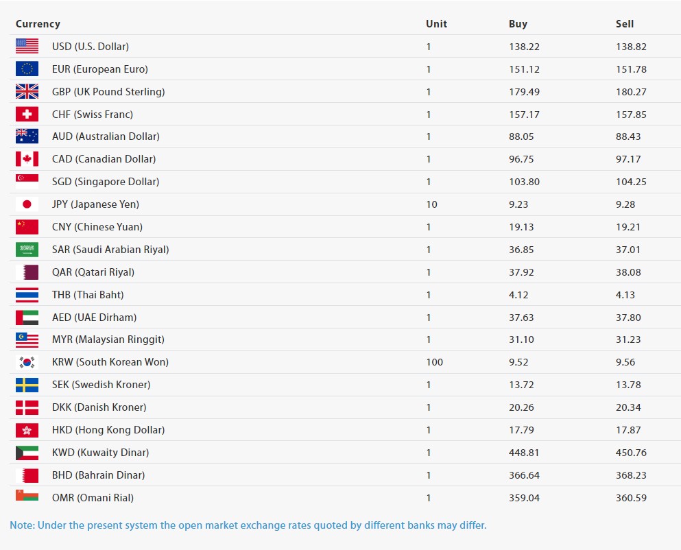 त्यस्तै युरोपियन युरो एकको खरिददर १५१.१२ रुपैयाँ र बिक्रीदर १५१.७८ रुपैयाँ, युके पाउण्ड स्टर्लिङ एकको खरिददर १७९.४९ रुपैयाँ र बिक्रीदर १८०.२७ रुपैयाँ, स्वीस फ्र्याङ्क एकको खरिददर १५७.१७ रुपैयाँ र बिक्रीदर १५७.८५ रुपैयाँ, अस्ट्रेलियन डलर एकको खरिददर ८८.०५ रुपैयाँ र बिक्रीदर ८८.४३ रुपैयाँ, क्यानाडियन डलर एकको खरिददर ९६.७५ रुपैयाँ र बिक्रीदर ९७.१७ रुपैयाँ रहेको छ।