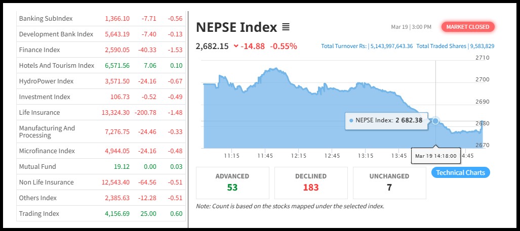 नेपाल स्टक एक्सचेञ्ज (नेप्से) १४.८८ अकंले घटेर २६८२.१५ बिन्दुका कायम भएको छ । आज ३११ कम्पनीको ९५ लाख ८३ हजार कित्ता शेयर किनबेच हुँदा ५ अर्ब १४ करोडको कारोबार भएको छ ।