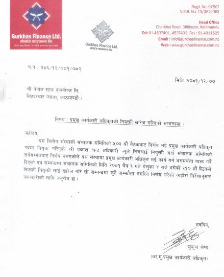 काठमाडौं । गोर्खाज फाइनान्स लिमिटेडका प्रमुख कार्यकारी अधिकृत प्रकाश चन्द्र अधिकारीको नियुक्ती खारेज गरिएको छ ।