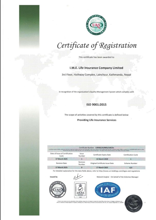 आईएमई लाइफलाई अन्तर्राष्ट्रिय गुणस्तर प्रमाणपत्र आईएसओ ९००१ः२०१५