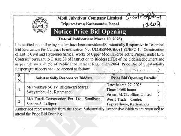 मोदी जलविद्युत् कम्पनी लिमिटेडले इपिसि मोडेलमा ३ अर्ब ३५ करोड रुपैयाँको लागतमा आयोजना निर्माण गर्न २०८१ माघ २३ गते ३५ दिने टेन्डर आह्वान गरेको थियो। यस अन्तर्गत साउथ एशियन इंफ्रास्ट्रक्चर प्रालि, टुन्डी कन्स्ट्रक्सन प्रालि, भुगोल कन्स्ट्रक्सन प्रालि, फेवा कन्स्ट्रक्सन प्रालि, वाइबा रामेछाप कन्स्ट्रक्सन (आरएससी जेभी) प्रालि लगायत पाँच कम्पनीले आवेदन दिएका थिए।