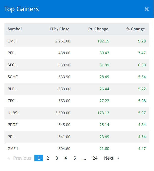 साथै, आज पोखरा फाइनान्सको ७.४७ प्रतिशत, समृद्धि फाइनान्सको ६.३० प्रतिशत, श्वतगंगा हाइड्रोपावरको ५.६४ प्रतिशत, रिलायन्स फाइनान्सको ५.२२ प्रतिशतले बृद्धि भएको छ ।