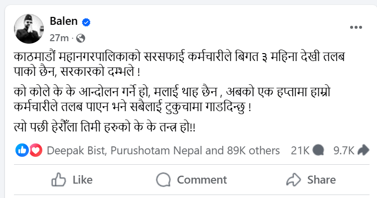 आजै काठमाडौं महानगरपालिकाका मेयर बालेन साहले समेत ७ दिने अल्टिमेटम दिँदै तन्त्र (शासन व्यवस्था) नै टुकुचामा गाडिदिने धम्की दिनुले वर्तमान शासन व्यवस्था दिनानुदिन कमजोर बन्दै गइरहेको र कुनै पनि कुनै पनि तरिकाबाट अन्त्यको दिशामा अघि बढ्ने स्पष्ट संकेतहरु देखा परिसकेको छ । यही चैत्र १५ गते समाजवादी मोर्चा र राजावादहीहरुले काठमाडौं केन्द्रीत विशाल शक्ति प्रदर्शन गर्दैछन् । राजावादी आन्दोलनका नेता दुर्गा प्रसाईको नेतृत्वमा कोटेश्वरमा आन्दोलन हुँदैछ भने समाजवादी मोर्चाले माइतीघर वा भृकुटीमण्डपमा आन्दोलन गर्दैछन् ।