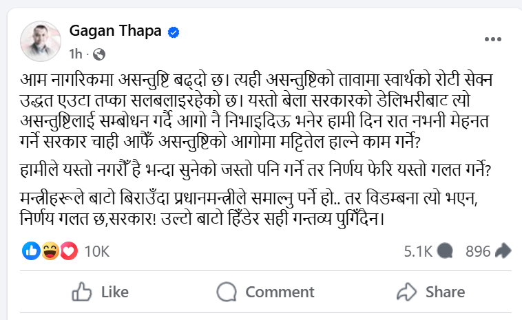 आज साँझ बसेको मन्त्रिपरिषदको बैठकले कूलमान घिसिङलाई हटाएर प्रधानमन्त्री ओलीका नातेदार हितेन्द्रदेव शाक्यलाई नियुक्त गर्ने निर्णयको विरुद्धमा नेपाली कांग्रेसका महामन्त्री गगन थापाले कडा स्टाटस लेख्दै प्रधानमन्त्री ओलीले आगोमा मट्टीतेल थपेको आरोप लगाएका छन् । त्यसैगरी, सत्ताधारी नेपाली कांग्रेसका अर्का महामन्त्री विश्व प्रकाश शर्माले पनि सरकारले कूलमानलाई हटाउने निर्णयमा नेपाली कांग्रेसको समर्थन नरहेको भन्दै आलोचना गरेका छन् ।