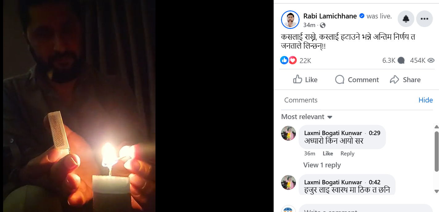 उता, सरकारले कूलमानलाई हटाएको विरोधमा रास्वपाका नेता रवि लामिछानेले मैनबत्ती बालेर कडा स्टाटस लेख्दै अब जनताले अन्तिम निर्णय गर्ने चेतावनीको भाषामा स्टाटस र कुटनीतिक भिडियो पोष्ट गरेका छन् । यसअघि जनतालाई नयाँ क्रान्तिको लागि तयार रहन आह्वान गरेका लामिछानेको आजको संकेत नयाँ क्रान्ति वा सत्ता कब्जा गर्न शान्तिपूर्ण जनविद्रोहतर्फ स्पष्ट संकेत गरेको छ ।