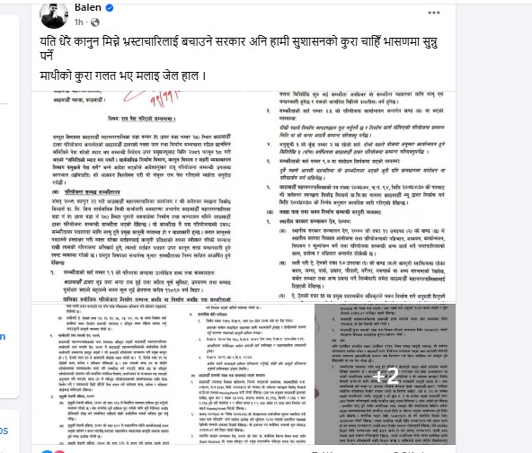 काठमाडौं । काठमाडौं महानगरपालिकाका मेयर बालेन्द्र साह (बालेन) ले प्रमुख प्रशासकीय अधिकृत सरोज गुरागाईंमाथि आरोप लगाउँदै सरकारलाई आफूलाई जेल हाल्न चुनौती दिएका छन्। उनले सामाजिक सञ्जालमार्फत लेख्दै, ‘यति धेरै कानुन मिच्ने भ्रष्टाचारीलाई बचाउने सरकार अनि हामीले सुशासनको कुरा भाषणमा मात्र सुन्नुपर्ने? माथिको कुरा गलत भए मलाई जेल हाल’ भनेका छन्।