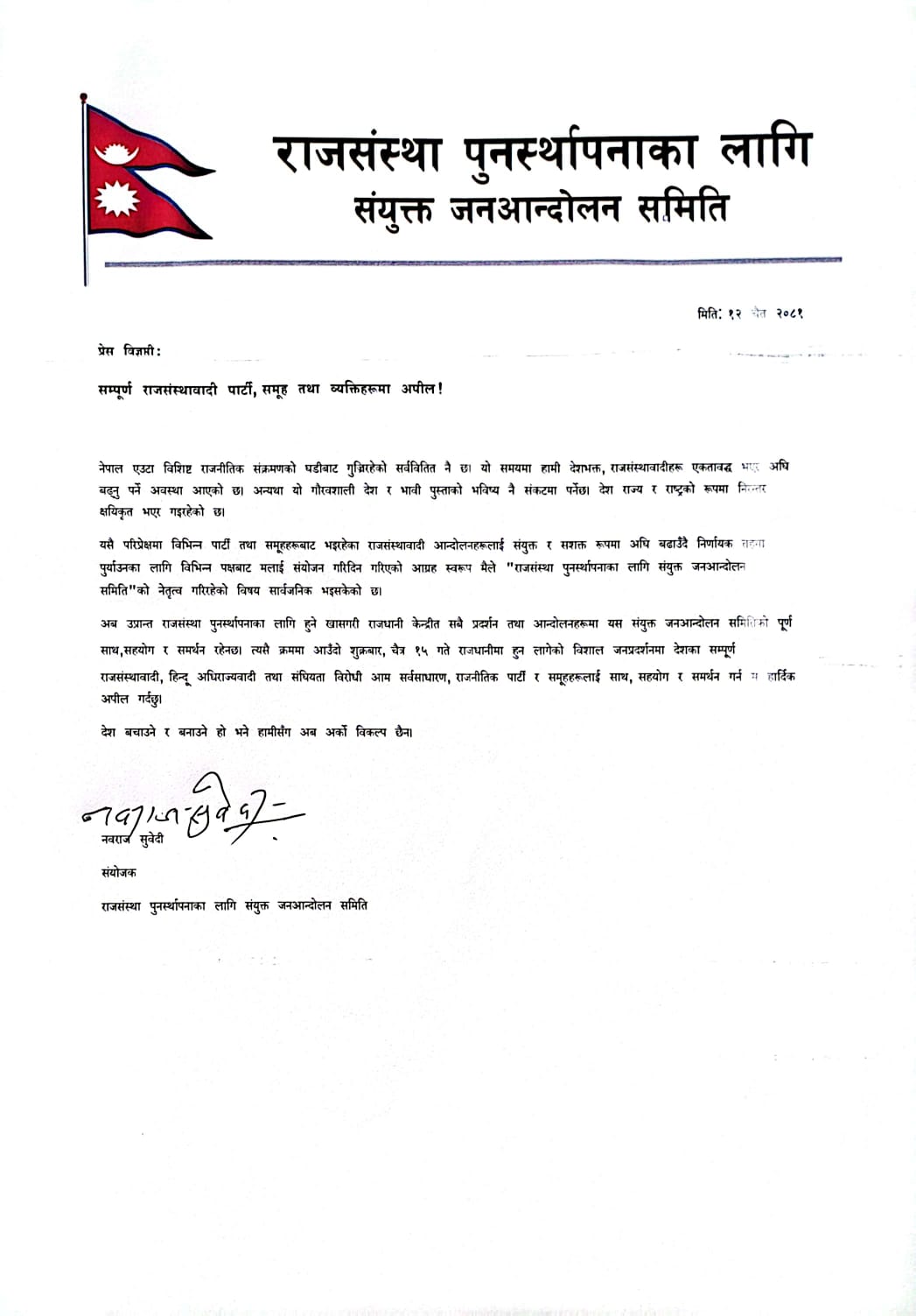 राजसंस्था पुनर्स्थापनाका लागि संयुक्त जनआन्दोलन समितिका संयोजक नवराज सुवेदीले एक विज्ञप्ति जारी गर्दै शुक्रबार विशाल जनप्रदर्शन गर्ने बताएका हुन्।