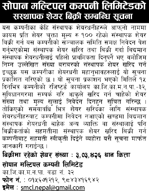 काठमाडौं । सोपान मल्टिपल कम्पनी लिमिटेडले ३ लाख ३ हजार ४२६ कित्ता संस्थापक शेयर बिक्रीमा राखेको छ। कम्पनीले यी शेयर कम्पनीकै विद्यमान संस्थापक शेयरधनीहरूले मात्र किन्न पाउने गरी बिक्रीमा राखेको हो।