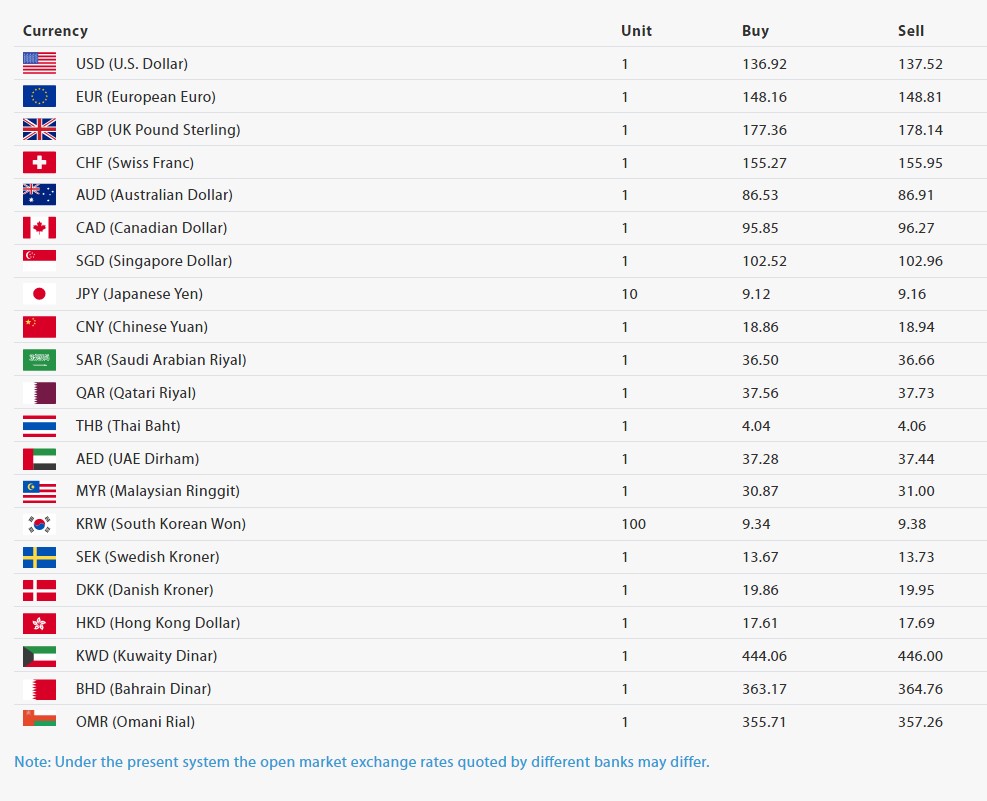 सिङ्गापुर डलर एकको खरिददर १०२.५२ रुपैयाँ र बिक्रीदर १०२.९६ रुपैयाँ, जापानी येन १० को खरिददर ९.१२ रुपैयाँ र बिक्रीदर ९.१६ रुपैयाँ, चिनियाँ युआन एकको खरिददर १८.८६ रुपैयाँ र बिक्रीदर १८.९४ रुपैयाँ, साउदी रियाल एकको खरिददर ३६.५० रुपैयाँ र बिक्रीदर ३६.६६ रुपैयाँ, कतारी रियाल एकको खरिददर ३७.५६ रुपैयाँ र बिक्रीदर ३७.७३ रुपैयाँ निर्धारण गरिएको छ।