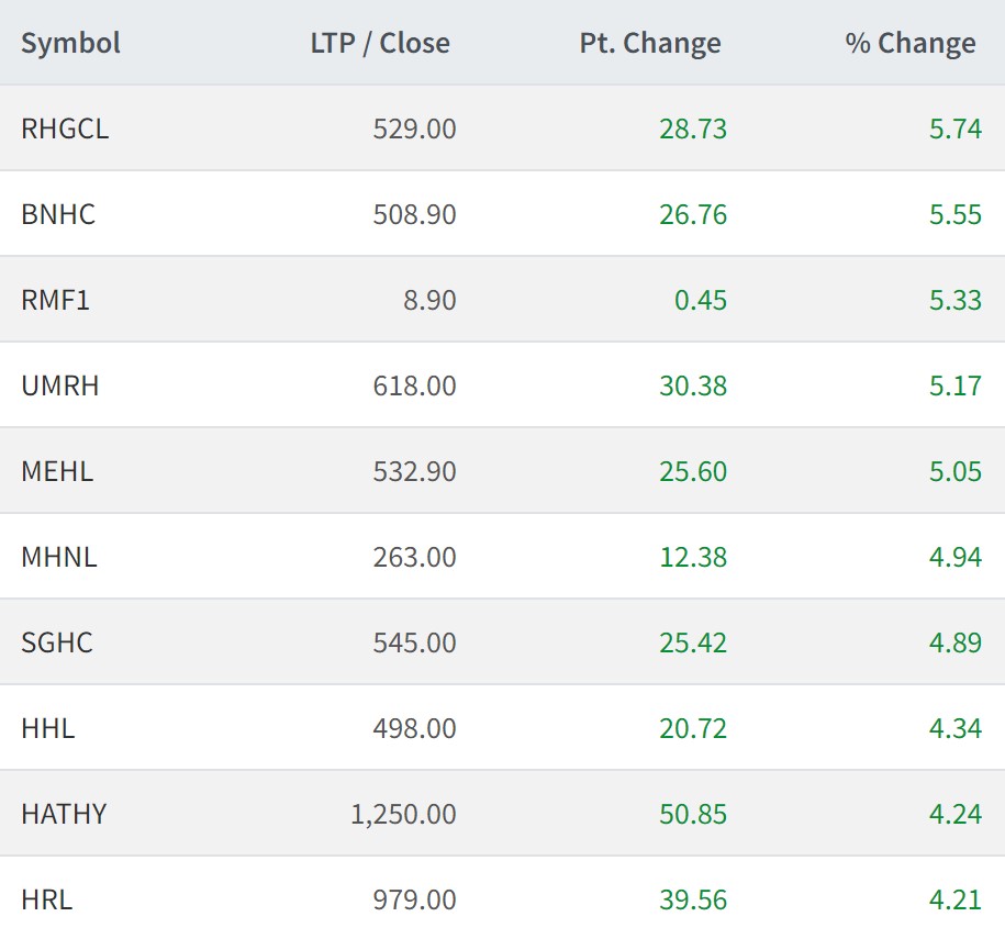 त्यस्तै बुद्धभूमि नेपाल हाइड्रोपवारको ५.५५ प्रतिशत, आरबिबि म्युचुअल फण्डको ५.३३ प्रतिशत, यूनाइटेड इदी मर्दीको ५.१७ प्रतिशत र मनकामना इन्जिनियरिङ हाइड्रोवारको ५.०५ प्रतिशतले वृद्धि भएको छ।