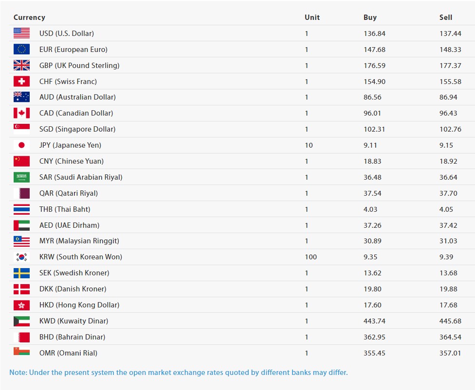 सिङ्गापुर डलर एकको खरिददर १०२.३१ रुपैयाँ र बिक्रीदर १०२.७६ रुपैयाँ, जापानी येन १० को खरिददर ९.११ रुपैयाँ र बिक्रीदर ९.१५ रुपैयाँ, चिनियाँ युआन एकको खरिददर १८.८३ रुपैयाँ र बिक्रीदर १८.९२ रुपैयाँ, साउदी रियाल एकको खरिददर ३६.४८ रुपैयाँ र बिक्रीदर ३६.६४ रुपैयाँ, कतारी रियाल एकको खरिददर ३७.५४ रुपैयाँ र बिक्रीदर ३७.७० रुपैयाँ निर्धारण गरिएको छ।