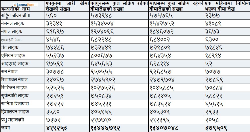 माघ महिनासम्ममा जीवन बीमा कम्पनीहरूले जारी गरेर सक्रिय रहेका कुल बीमालेखको संख्या एक करोड ३४ लाख सात हजार रहेकोमा फागुनसम्ममा यो संख्या एक करोड ३४ लाख ४६ हजार पुगेको छ।