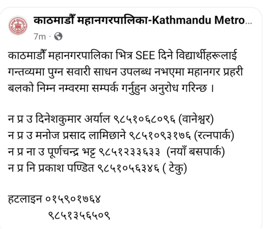 यसैलाई मध्यनजर गर्दै एसईई दिएका परीक्षार्थीहरूलाई गन्तव्यमा पुग्न सवारी साधन उपलब्ध नभएमा वा अन्य कुनै समस्या परेमा उनीहरूको उद्धार गर्न काठमाडौं महानगरपालिकाले महानगर प्रहरी परिचालन गर्ने निर्णय गरेको हो।
