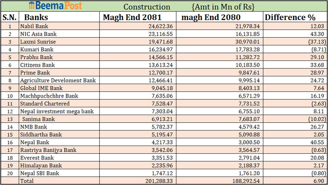 माघ मसान्तसम्मको अवधिमा नेपाल इन्भेष्टमेन्ट मेगा बैंकले ७ अर्ब ३० करोड, सानिमा बैंकले ६ अर्ब ९१ करोड, एनएमबि बैंकले ५ अर्ब ७८ करोड, सिद्धार्थ बैंकले ५ अर्ब १९ करोड, नेपाल बैंकले ४ अर्ब २१ करोड, राष्ट्रिय वाणिज्य बैंकले ३ अर्ब ५४ करोड, एभरेष्ट बैंकले ३ अर्ब ३५ करोड, हिमालयन बैंकले २ अर्ब २३ करोड र नेपाल एसबिआई बैंकले १ अर्ब ७४ करोड रुपैयाँ निर्माण क्षेत्रमा लगानी गरेका छन् ।