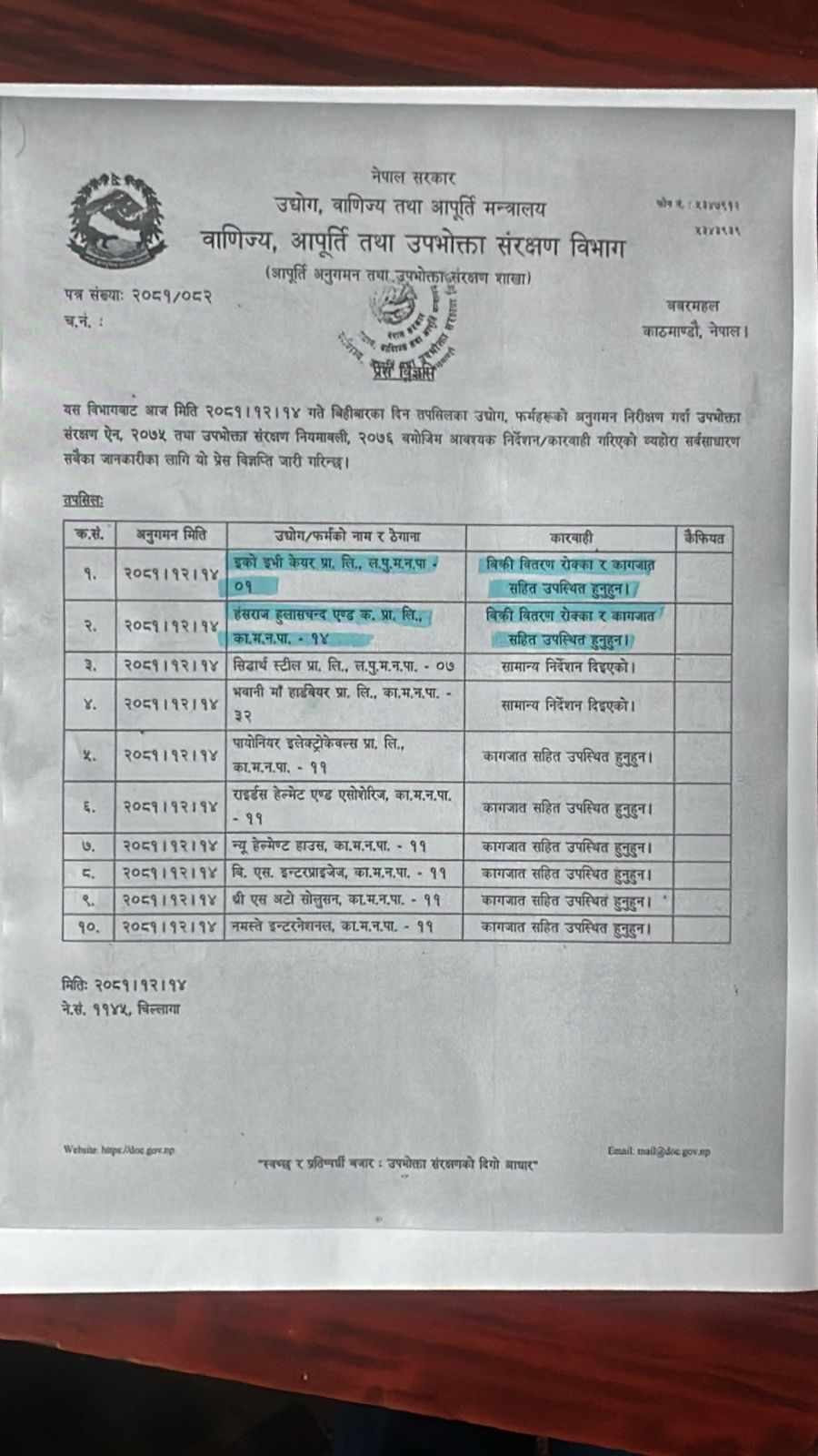 विभागले कम्पनीलाई आवश्यक कागजातसहित उपस्थित भई स्पष्टिकरण दिन निर्देशन दिएको छ। कम्पनीले उपभोक्ता मूल्य निर्धारणका आधारहरू र व्यवसायिक कागजातहरू पेश नगरे थप कारबाही हुन सक्ने विभागले चेतावनी दिएको छ।