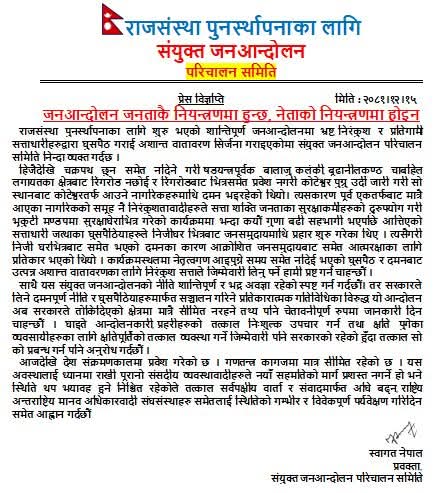 समितिले सरकारको दमनकारी नीति र शान्तिपूर्ण प्रदर्शनलाई हिंसात्मक बनाउन गरिएको घुसपैठको निन्दा गर्दै आन्दोलन झनै सशक्त हुने चेतावनी दिएको छ। विज्ञप्तिमा उल्लेख गरिएअनुसार बालाजु, कलंकी, बूढानीलकण्ठ, चाबहिल लगायतका स्थानबाट रिंगरोडभित्र प्रवेश नै गर्न नदिई प्रदर्शनकारीलाई नियन्त्रण गर्ने प्रयास भएको थियो। कोटेश्वर क्षेत्रमा समेत प्रदर्शनकारीलाई रोक्ने नाममा सुरक्षा संयन्त्रलाई प्रयोग गरिएको समितिको आरोप छ।