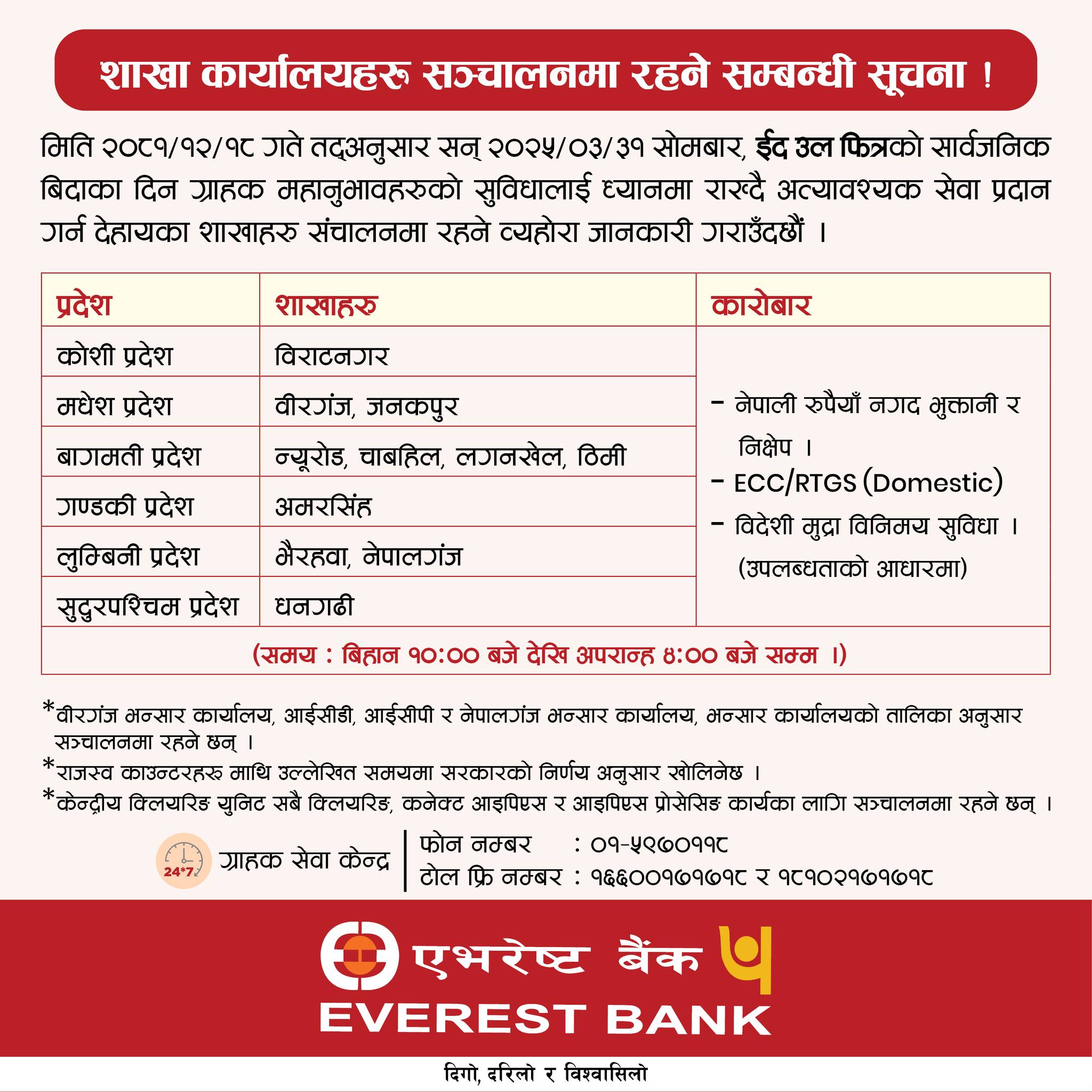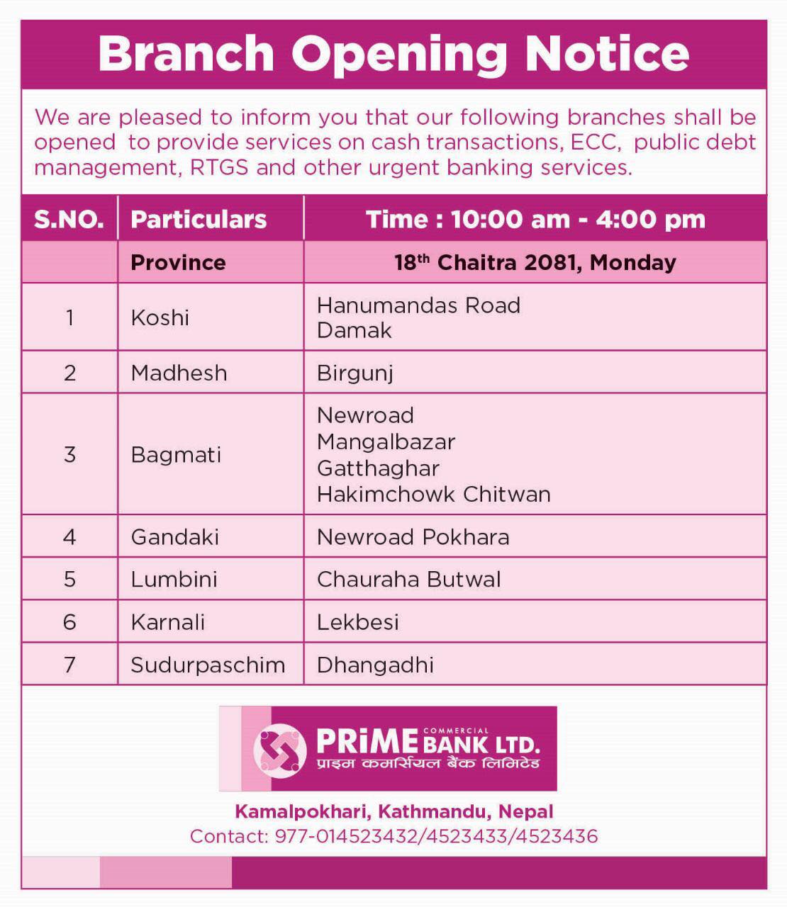 सोमबार विभिन्न बैंकहरुले उपत्यका भित्र र देशका विभिन्न व्यापारीक तथा बढी मानिसहरु बसोबास गर्ने स्थानका शाखा कार्यालय खुल्ला गरेर बैकिङ्ग सेवा दिरहेका छन् । बैंकहरुले आफ्ना विभिन्न आधिकारीक सामाजिक सञ्जाल मार्फत सार्वजनिक सूचना जारी गर्दै सार्वजनिक विदाको दिन खुल्ला रहने तथा बैंकिङ्ग सेवा लिन सकिने शाखा कार्यालयको सूची सार्वजनिक गरेका छन् ।