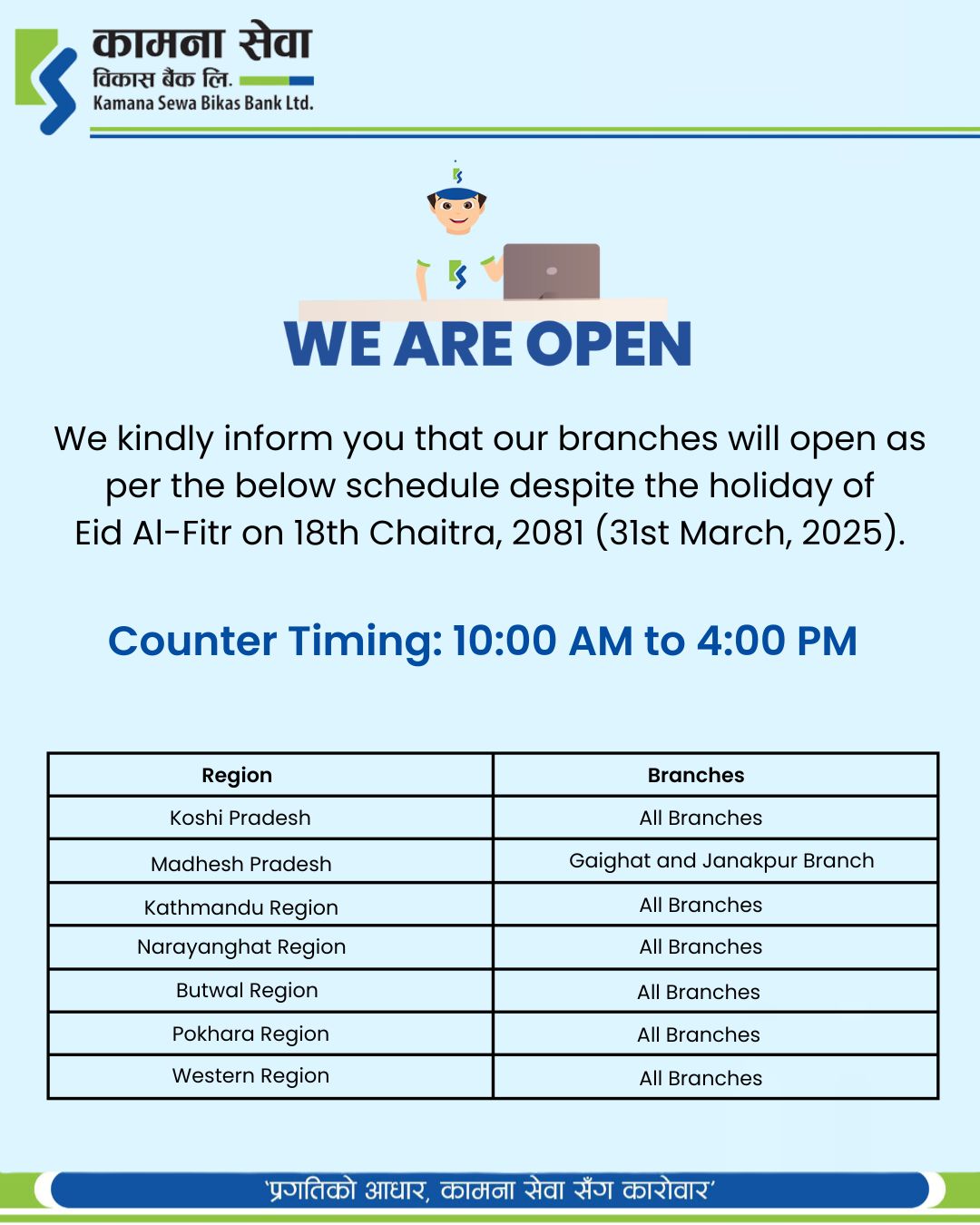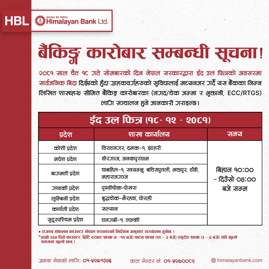 काठमाडौं । सरकारले ईद उल फितरको अवसरमा सोमबार देशभर सार्वजनिक बिदा दिएको छ । नेपालका दुई दर्जन बढी विकास तथा वाणिज्य बैंकहरुले आफ्ना ग्राहकहरुको समस्यालाई मध्य नजर गर्दै सीमित शाखा कार्यालयहरु सञ्चालन गरेर बैकिङ्ग सेवा प्रदान गरेका हुन् ।