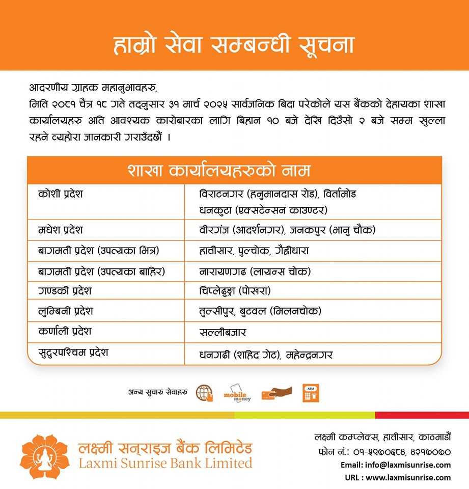 सार्वजनिक विदाको दिन बैंकिङ्ग सुविधा उपलब्ध, बैंकका यी शाखाहरुबाट लिनुहोस सेवा (सूचीसहित)