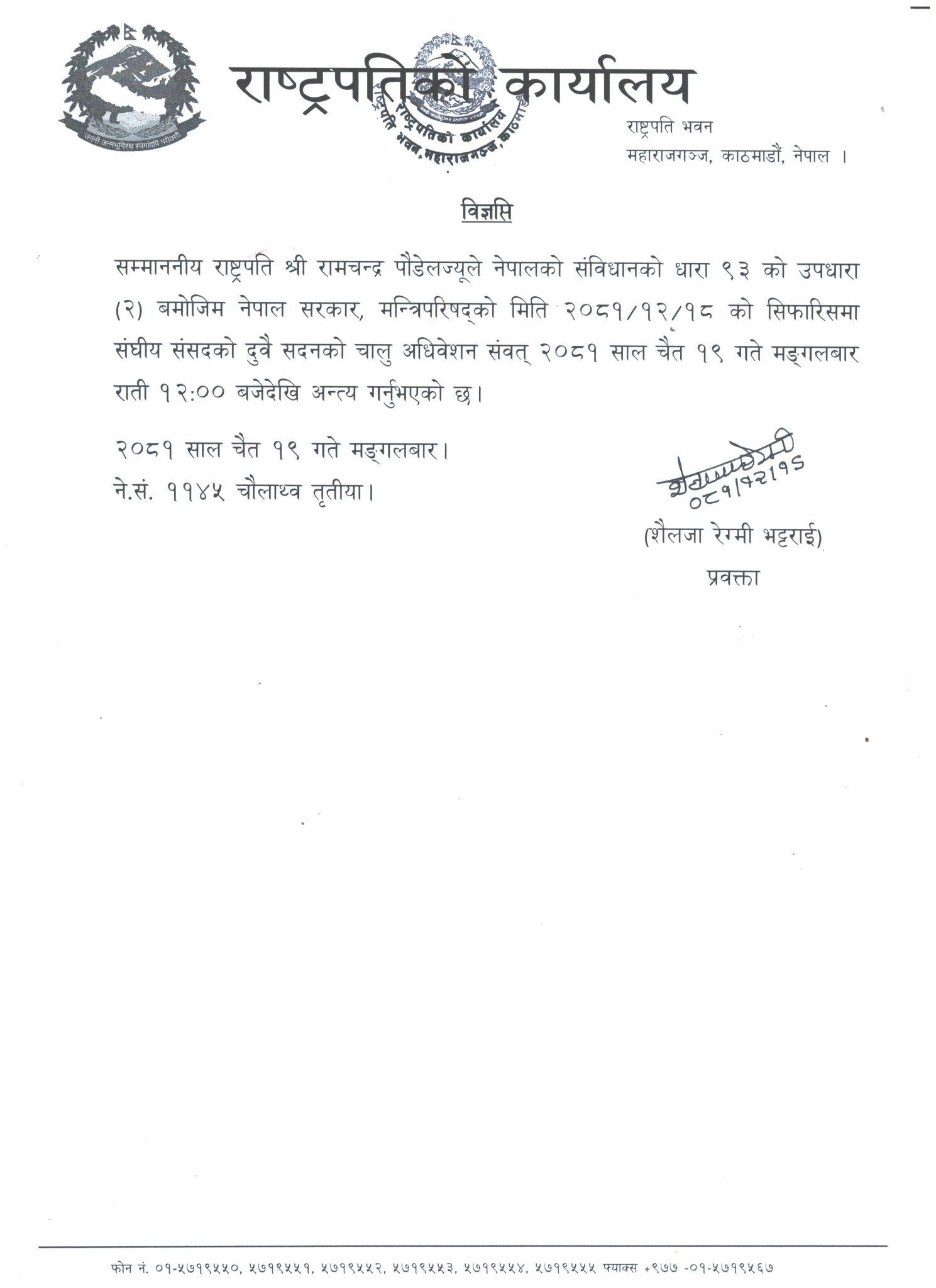 यसअघि, सोमबार बसेको मन्त्रिपरिषद्को बैठकले संसद् अधिवेशन अन्त्य गर्न राष्ट्रपतिसमक्ष सिफारिस गरेको थियो। सोही सिफारिसअनुसार संसद्को यो अधिवेशन आजको अन्तिम बैठकपछि औपचारिक रूपमा समाप्त भएको छ।
