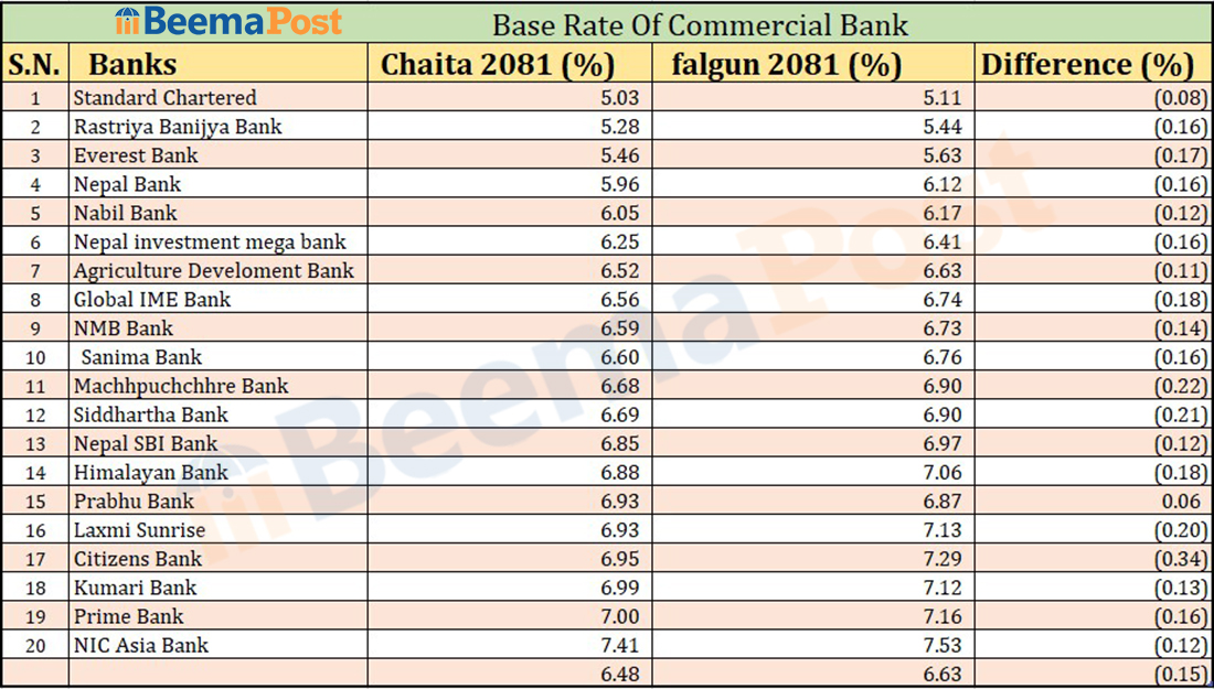 हाल बैंकहरुको औसत बेस रेट ६.४८ प्रतिशत बिन्दुमा झरेको छ । गत फागुन महिनामा भने ६.६३ प्रतिशत रहेको थियो।