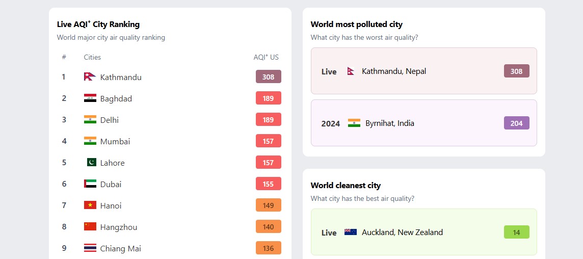 विश्वका अन्य प्रमुख शहरहरूको तुलनामा काठमाडौंले सबैभन्दा खराब वायु गुणस्तर प्रदर्शन गरेको छ। बगदाद (इराक) दोस्रो स्थानमा छ, जहाँ ए.क्यू.आई. २०३ छ। दिल्ली (भारत) तेस्रो स्थानमा १८९ ए.क्यू.आई. देखिएको छ। प्रदूषणको उच्च स्तरले स्थानीय जनस्वास्थ्यमा प्रतिकूल असर पार्न सक्ने संभावना बढाएको छ, जसले वासिन्दाहरूसँग श्वासप्रश्वास समस्याहरू उत्पन्न गर्न सक्छ।