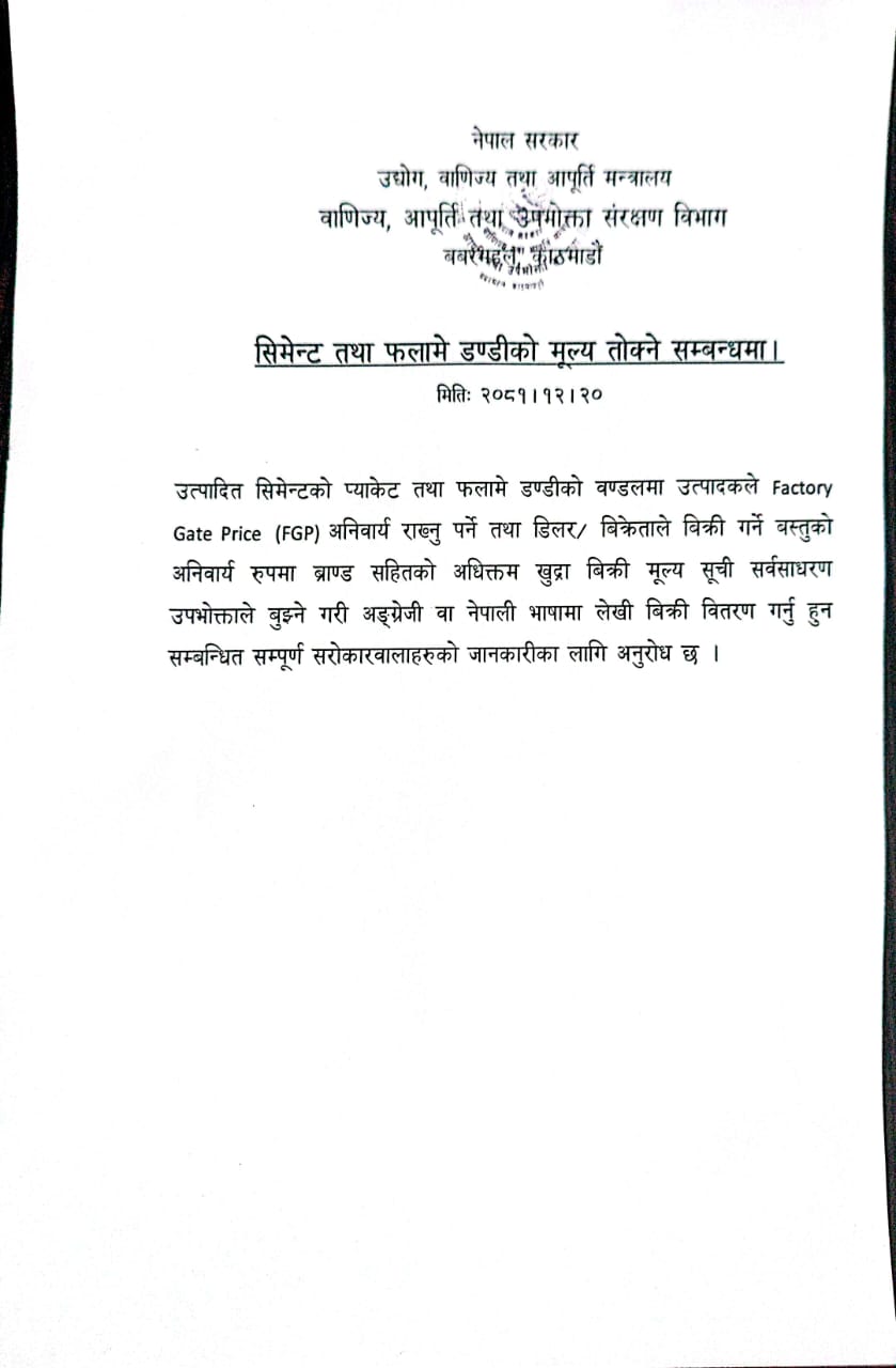 नयाँ व्यवस्थाअनुसार डिलर वा बिक्रेताले बिक्री गर्ने सिमेन्ट तथा फलामे डण्डीको ब्राण्डसहित अधिकतम खुद्रा मूल्य उपभोक्ताले सहजै बुझ्ने गरी नेपाली वा अंग्रेजी भाषामा स्पष्ट रूपमा लेखी बिक्री गर्नुपर्नेछ। विभागले यस निर्णय कार्यान्वयन गर्न सरोकारवाला सबै पक्षलाई आग्रह गरेको छ।