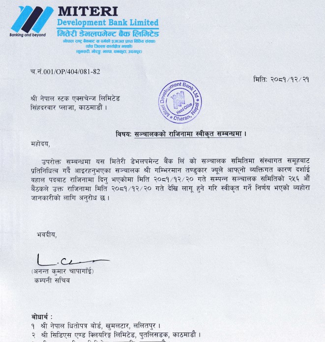 मितेरी डेभलपमेन्ट बैंकका सञ्चालकद्वारा राजिनामा