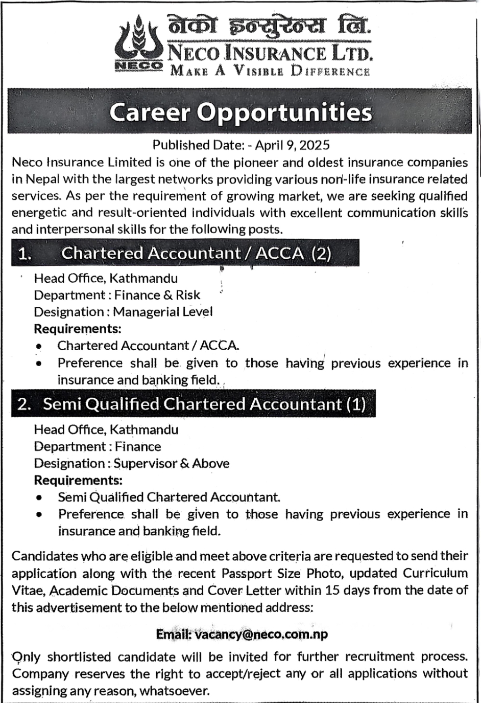 काठमाडौं । नेको इन्स्योरेन्स लिमिटेडले काठमाडौंस्थित मुख्य कार्यालयका लागि चार्टर्ड एकाउन्टेण्ट २ जना र सेमि क्वालिफाइड चार्टर्ड एकाउन्टेण्ट १ जना माग गरेको छ।