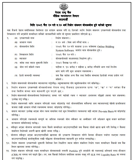 इच्छुक बैंक तथा वित्तीय संस्थाले आज दिउँसो ३ बजेसम्म बोलकबोलमार्फत आवेदन दिन सक्नेछन् । साँवा र ब्याज भुक्तानी मिति २०८२ वैशाख १७ गते निर्धारण भएको छ । यसको ब्याजदर भने बोलकबोल बाटै निर्धारण हुनेछ ।