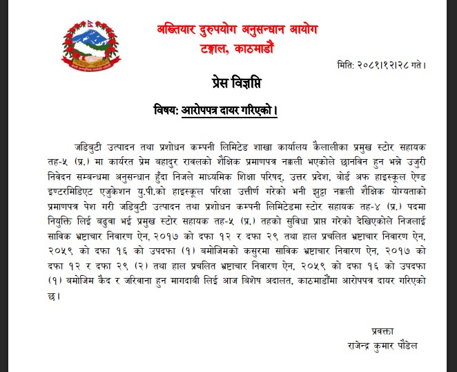 काठमाडौँ । जडिबुटी उत्पादन तथा प्रशोधन कम्पनी लिमिटेड शाखा कार्यालय कैलालीका प्रमुख स्टोर सहायक तह–५ मा कार्यरत प्रेम बहादुर रावलविरुद्ध अख्तियार दुरुपयोग अनुसन्धान आयोगले बिशेष अदालतमा मुद्दा दायर गरेको छ । नक्कली शैक्षिक प्रमाणपत्र नक्कली पेश गरेर जागिर खाएको अभियोग उनीमाथि छ।